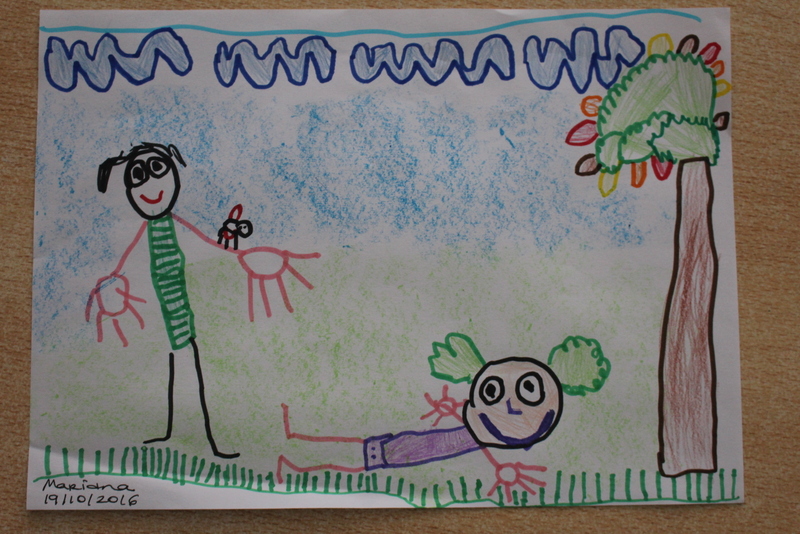 A Sara quis contar hoje a seguinte história: Era uma vez a feiticeira do parque que fez um feitiço a dormir a um menino, depois deitou pintinhas de joaninha da sua boca para a cara do menino. O menino foi brincar com os amigos e eles riram se dele. O menino no dia a seguir não quis ir para a escola porque pensava que os meninos iam rir dele, e não quis ir mais para a escola. No outro dia esfregou a cara com sabonete até aos olhos e com agua mas as pintinhas não saíram da cara. Mas no outro dia viu que já não tinha as pintinhas e já podia ir para a escola, brincar com os amigos. Mas a bruxa decidiu fazer outro feitiço, suprou as pintas da joaninha para a testa do menino mas as pintas foram para as asas da joaninha. Ficaram felizes para sempre e o Jaime passou a ir todos os dias para a escola.