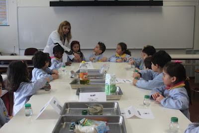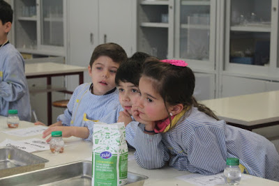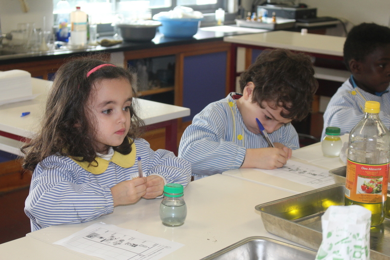 Hoje fomos ao laboratório e quando lá chegamos cada um tinha um papel que era de umas coisa que são para fazer comida. Depois fizemos grupos de 2, eu fiquei com o Leandro e nós éramos do grupo do azeite. Depois as professoras cientistas deram-nos uma tampa do frasco de iogurte com azeite, e eu e o Leandro pusemos dentro do nosso copo de água. Era para ver se o azeite desaparecia mas não desapareceu as professoras disseram para abanar-mos e a água ficou branca, de abanar tanto. Depois as professoras cientistas deram-nos um papel para escrever o que desaparecia na água e o que não desaparecia. O azeite, a areia, as cascas dos ovos não desapareceram, o sal e o açúcar desapareceram na água.