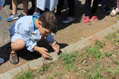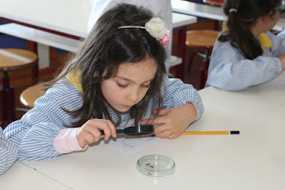 Começou por as professoras porem umas caixas redondas de vidro, de vidro não... são de plástico. Depois estavam lá formigas que a professora Sílvia apanhou. Apanhou as formigas na relva. Nós observámos com uma lupa e vimos as formigas grandes. Nós achávamos que as formigas tinham 4 patas, mas observámos e vimos que tinham 6 patas, 3 para cada lado. Têm 2 olhos, 3 partes do corpo e 2 antenas. São pretas, meio acastanhadas ou vermelhas. Depois tínhamos de as libertar, fomos à rua, abrimos a caixa, inclinámos um pouco e elas saíram. Vimos 1 formiga a levar comida. Nos formigueiros há muitos túneis e muitas formigas. Acabou.