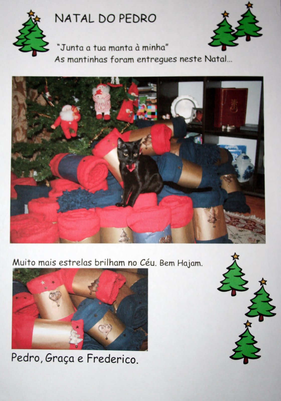 Neste Natal pedimos à família e amigos para darem uma manta nova (polar), em nome do Pedro, para oferecermos aos "Sem Abrigo". Os familiares e amigos não são tantos como os "Sem Abrigo", pelo que não poderão ser entregues na Festa de Natal, por não chegarem para todos. Gostávamos que fossem entregues na Noite de Natal aos "Sem Abrigo" da Avenida Almirante de Reis, mesmo como prenda de Natal, para que aquela noite seja, também para eles, especial e lhes possa aquecer o coração.